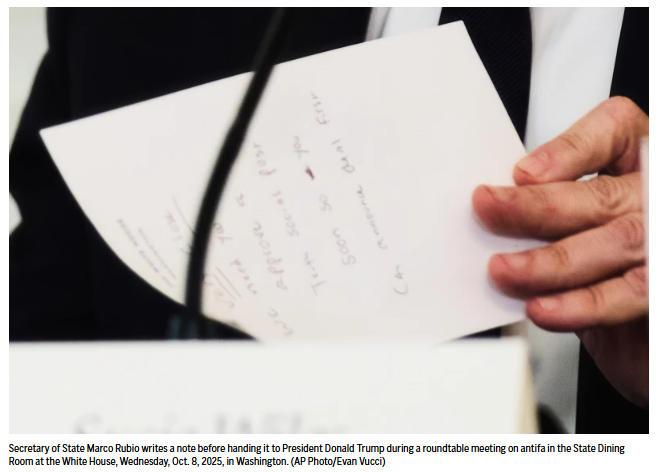 中新网10月9日电 据美联社报道,当地时间8日,美国总统与特朗普举行回合会晤时,国务卿卢比奥向特朗普递交了照会。图片来源:美联社报道截图。报道称,记者在现场拍到了这张纸条。内容是手写的:“你需要尽快认可一个现实。”社交(真正的社交)帖子,这样您就可以成为第一个表达同意的人。 ” 特朗普说:“国务卿刚刚给我一张照会,说我们已经接近与中东问题达成协议,他们要求我尽快出庭,我们将再回答几个问题。” ”一些媒体提问,其中说:“我今天必须努力解决中东的一些问题。 ”